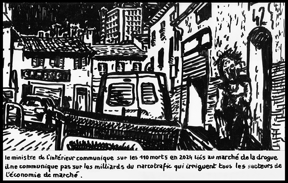 Dessin sur le vif, dans la voiture stationnée rue Hector Berlioz. Marseille