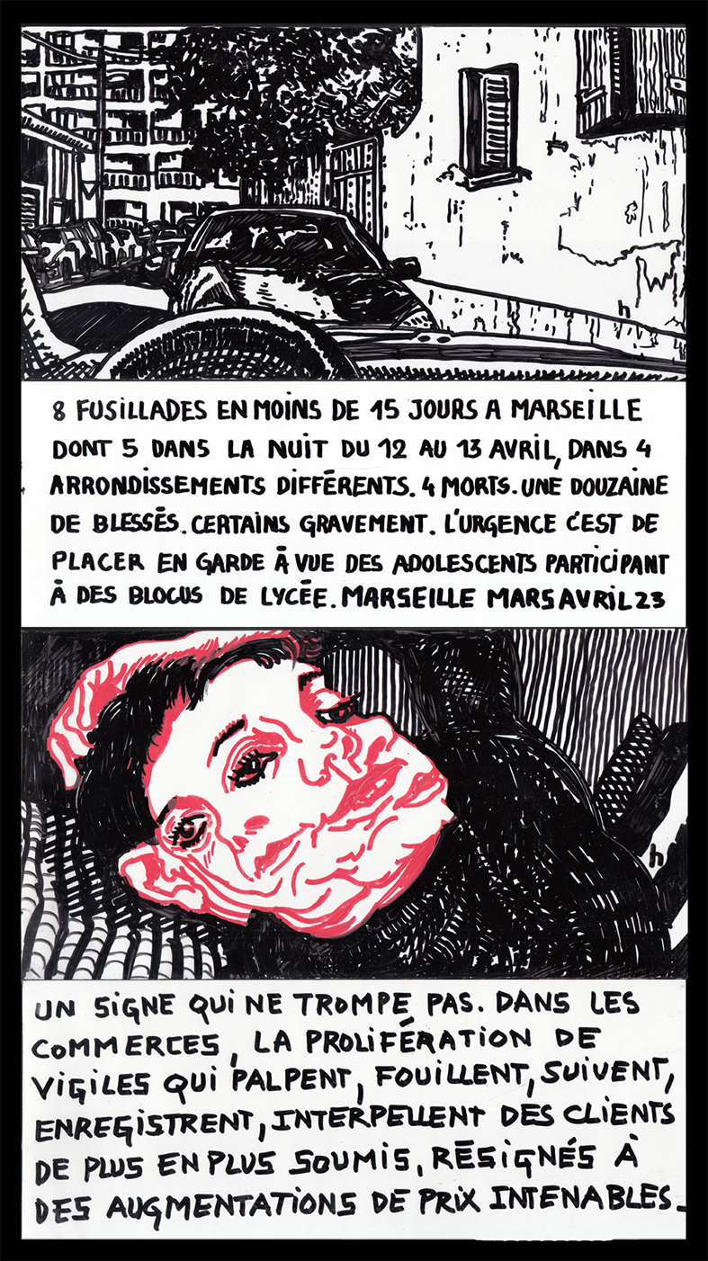 Dessin sur le vif, dans la voiture stationnée rue Hector Berlioz. Marseille