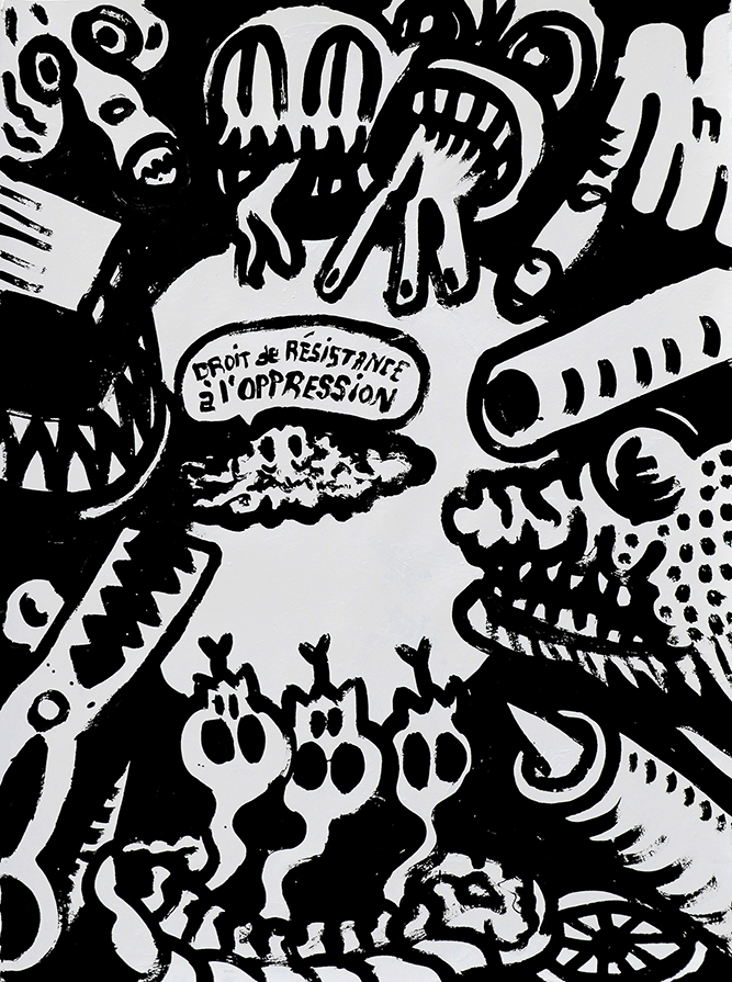 Markers, stylos couleurs, crayons de couleurs, plume & encre, acrylique, gouache. 82,5 x 89 cm.