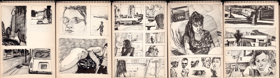 CARNET DE CROQUIS, feutre noir, portraits d'amies, proches, voisins, et de paysages au fil des déplacements, 1995