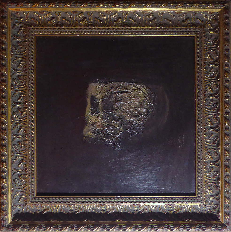Crâne, vanité, de la série toiles et toilettes. Huile sur toile marouflée sur panneau, 30 x 30 cm. 1992.